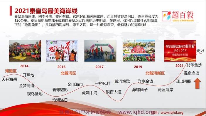 答:2021年6月5号的超百毅®赛事在中国秦皇岛最美海岸线举办,根据天气情况、城市特色和海岸线独特风景,创新采用上面独特的赛制。秦皇岛海岸线,四季分明,变化有律。它东起山海关南张庄,西止昌黎县滦河口,原生总长度为120公里。秦皇岛的海岸线承载着自秦皇汉武以来的历史明鉴,在这里,你可以读懂什么叫做真正的“沧海桑田”,是首都的海岸线、帝王之海,是一片最有希望、最有魅力的海岸线!