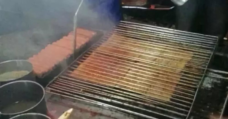 碳烤是烤冷面老祖,当年老盖就是凭借这一绝技俘获大批狂热信徒。冷面片一开始用竹签串好,随着销量骤增,老盖又发明了铁帘式烤法。