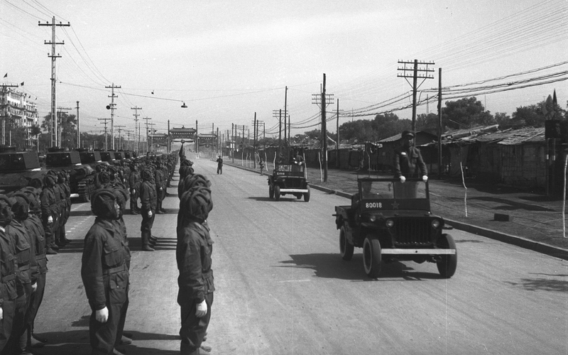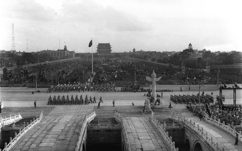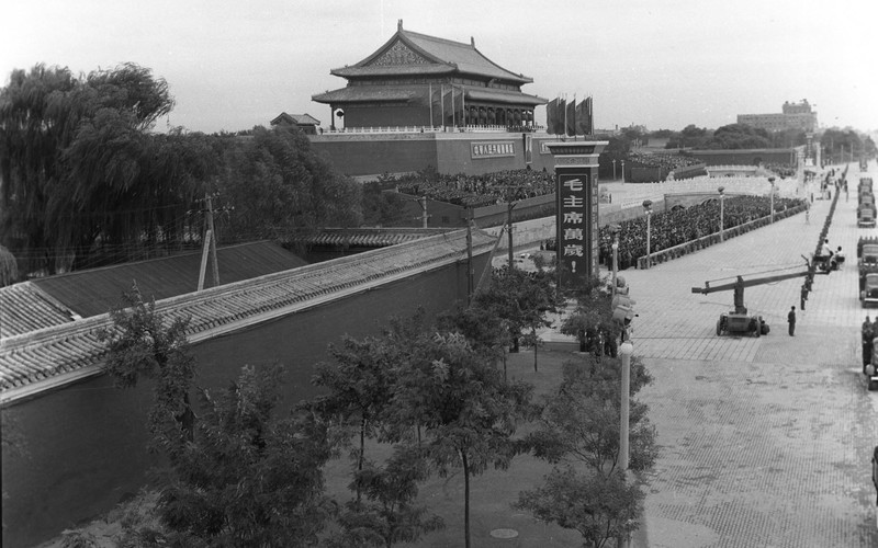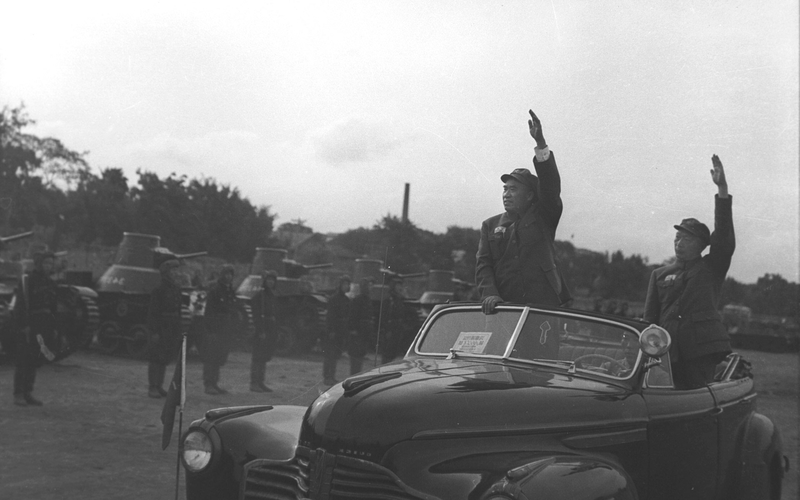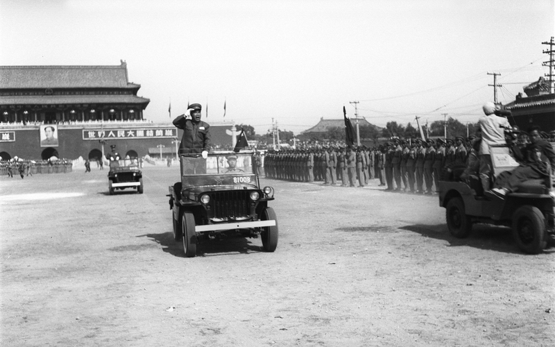 1949年10月1日在天安门广场举行的开国大典,朱德在阅兵总指挥聂荣臻陪同下,乘敞篷汽车检阅部队。中国人民解放军受阅部队列成方阵,由东向西分列式通过天安门广场