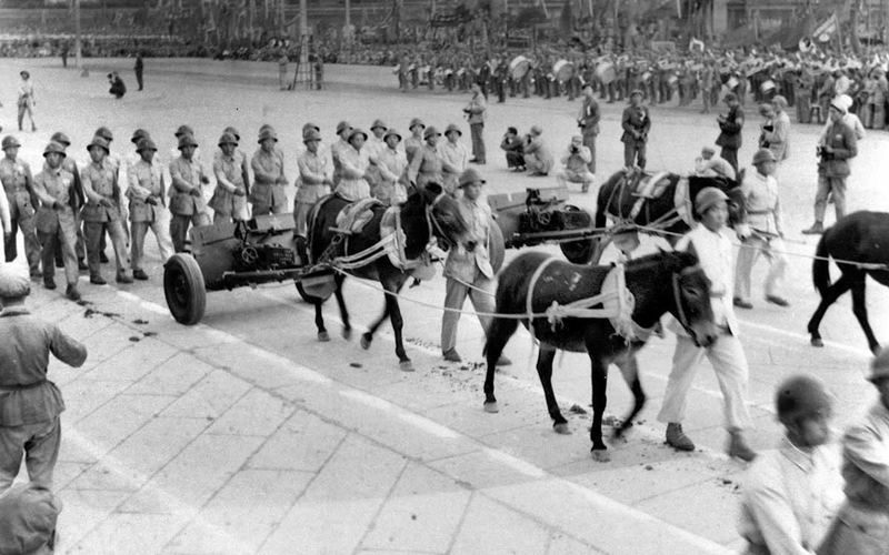 1949年10月1日,受检阅的中国人民解放军山炮部队由骡马拖拽,参加分列式