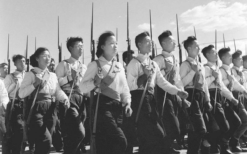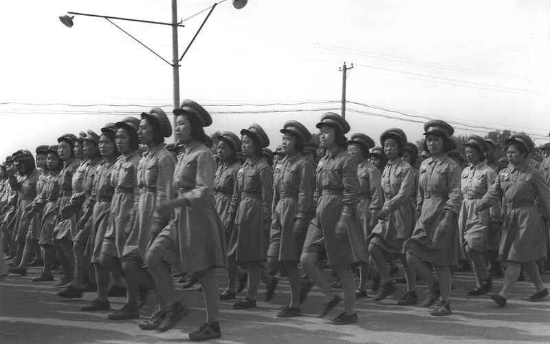 1958年10月1日,国庆阅兵式。由工人、农民、学生组成的众多民兵方队出现在受阅队伍中。女民兵方队首次在国庆大阅兵中出现