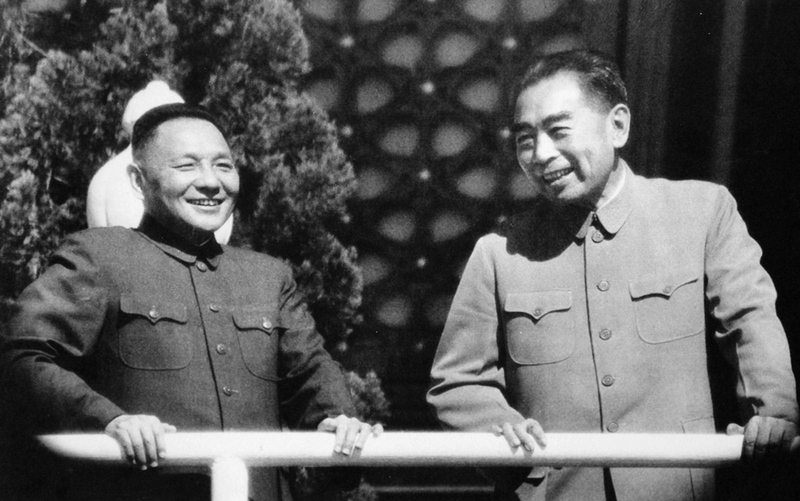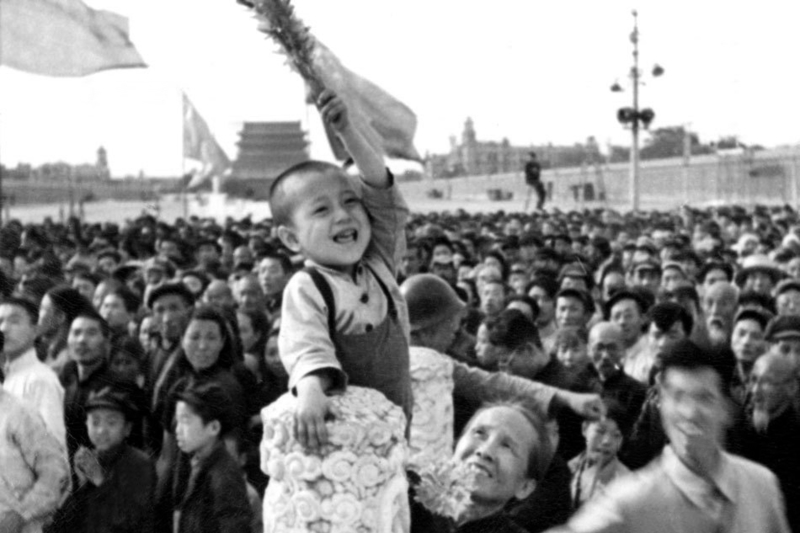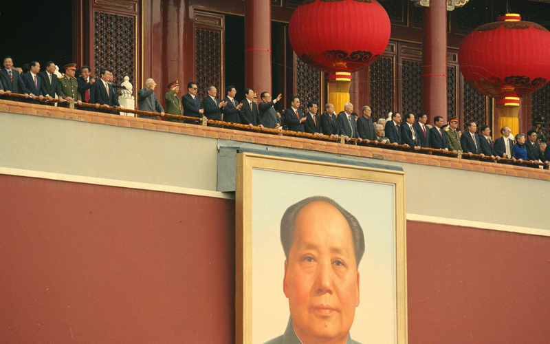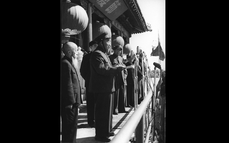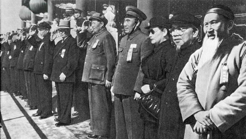 1953年10月1日,左至右:沈钧儒,邓小平,郭沫若,陈震,林伯渠,周恩来,张澜,宋庆龄,刘少奇,毛泽东,朱德,李济琛,高岗,陈叔通,董必武,黄炎培,彭真。