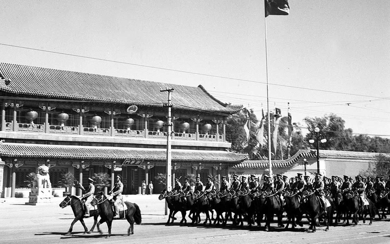 1949年中华人民共和国开国大典上,参加分列式的中国人民解放军骑兵部队在行进中。新华社发(资料照片)