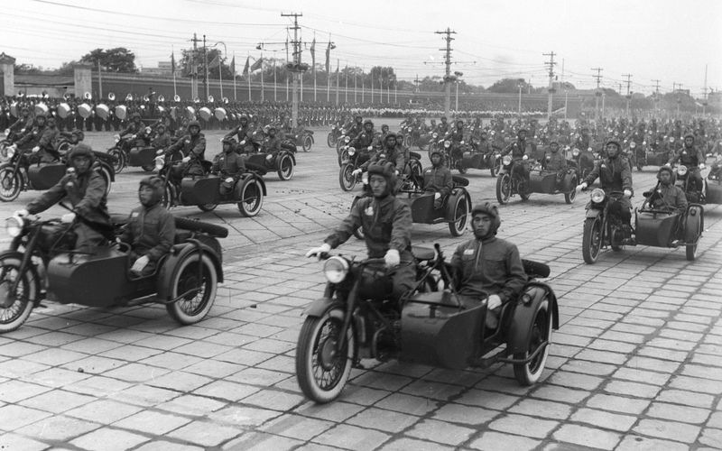 1954年10月1日,第6次国庆阅兵。天安门游行队伍——摩托化部队通过天安门。这次阅兵是中国人民解放军骑兵部队最后一次接受检阅。整个阅兵,历时63分钟