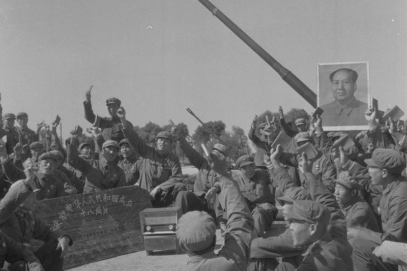 1967年10月1日,驻京空军高炮某部军人围聚在收音机和毛泽东像旁,收听国庆游行的实况广播和时任国家副主席林彪的讲话。唐禹民/CFP