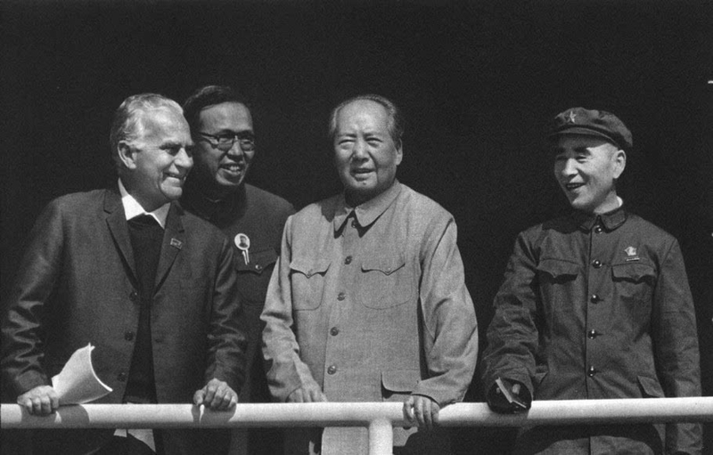 1970年10月1日,毛泽东、林彪在天安门城楼上,与埃德加·斯诺交谈甚欢