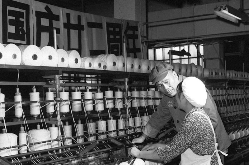 1971年10月2日,天津第二毛纺厂老工人李长茂和粗纱车间的工人,在国庆节期间坚守在生产岗位上。田明/新华社