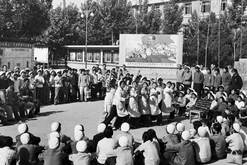 1971年国庆期间,工厂的业余文艺宣传队表演节目。供图:新华社