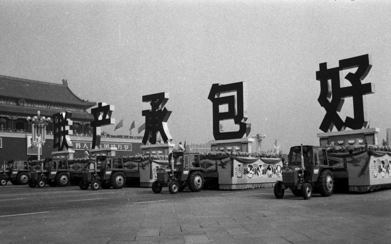 1984年10月1日,北京,改革开放再阅兵。在国庆的游行队伍中,农民开着拖拉机,载着“联产承包好”的牌子经过天安门广场
