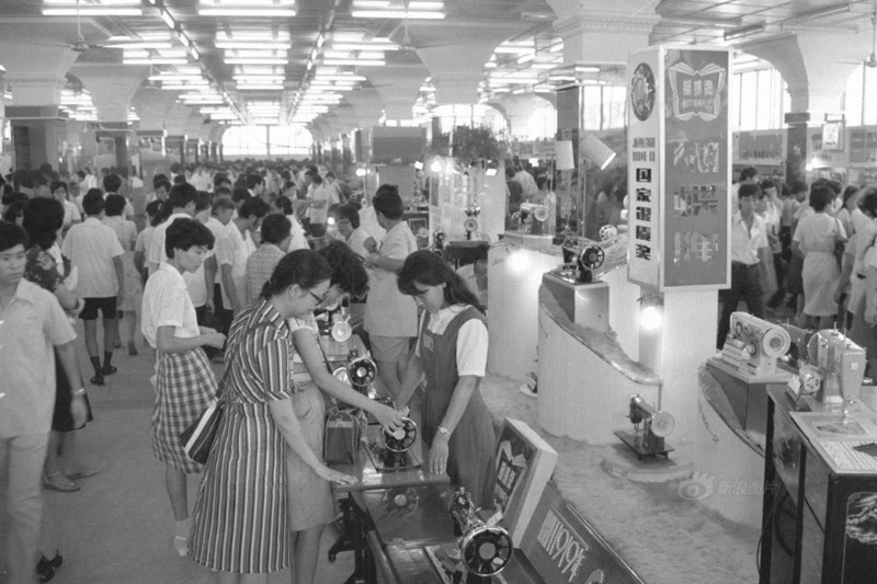 1985年国庆前夕,上海市“第三批名牌产品评选展销会”现场。该展销会将自行车、缝纫机、电视机、化妆品等八大类的名牌产品在曹杨商场集中投放,日销售额接近全国著名的上海市第一百货商店。任珑/新华社
