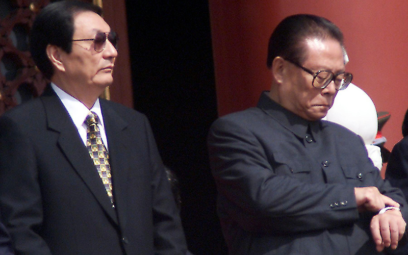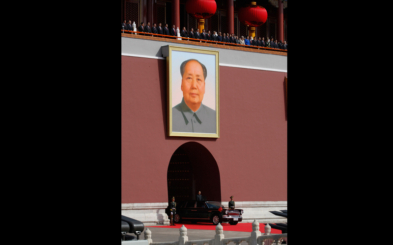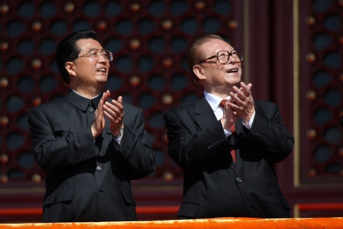 2009年国庆节,胡锦涛、江泽民在天安门城楼上。