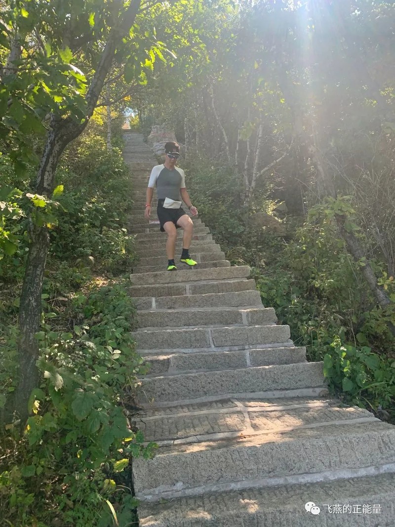 说是女子第一刚过去,可是我一直追到五人岭都没看见人,五人岭到天女峰又是爬台阶,峰回路转之间竟然看到了粉红腿套的美女,一个人在台阶那喝水。我问:咋啦,她说累了,跑不动了。我喊了一声加油就往前跑去。