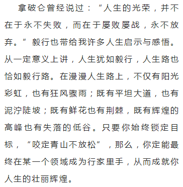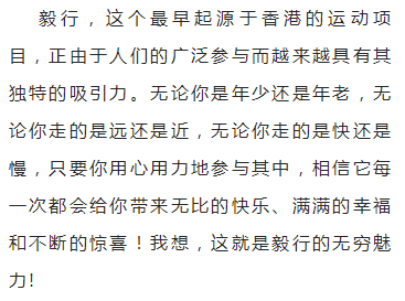但我以为,这也许正是毅行的巨大魅力所在。记得一位哲人说过:“成功就是在别人停下来的地方,你再向前一步。”因为,越是到最后阶段,越是考验毅行者的体力与意志之时。在这个关键时段,每走一步,都是你坚持与退缩之间的反复教量,只要咬牙挺过这个疲劳期,迈过这个迈儿,你就是最后的胜利者。当你通过连续几个小时的奋力拚搏,最后一步跨过终点,冲开红绸布的那一瞬间,并且耳旁传来同事们的阵阵喝彩声时,你会心中充满了成就感,那所有的疲劳与辛苦,都会一扫而光!这种挑战极限、战胜自我,最终取得胜利的幸福感和自豪感,是难以用语言形容的。