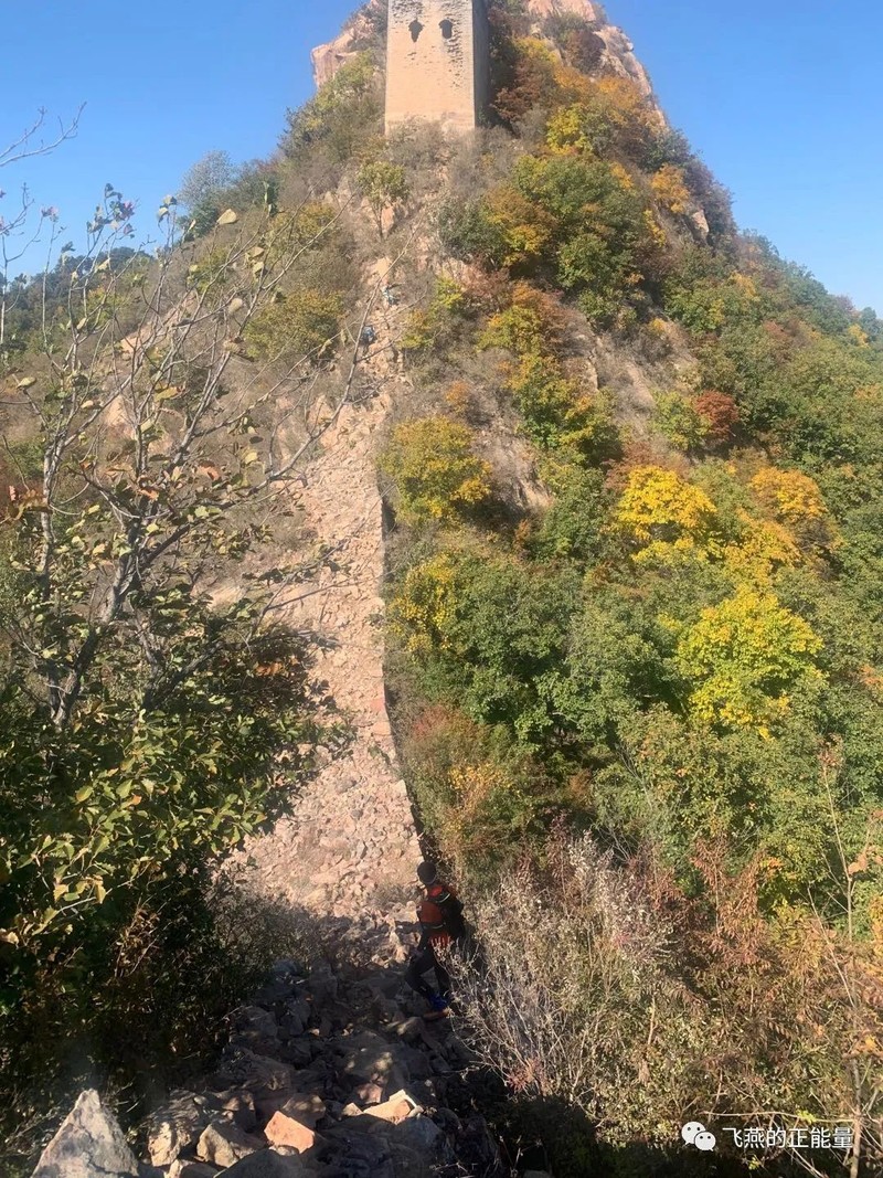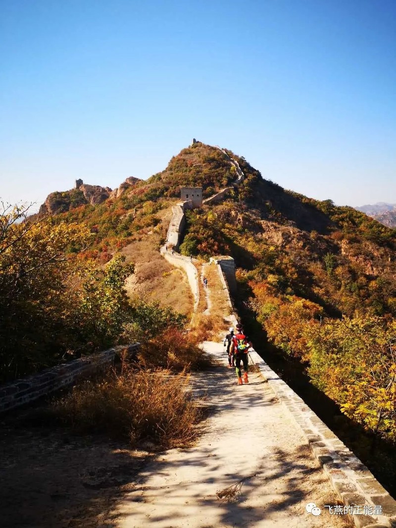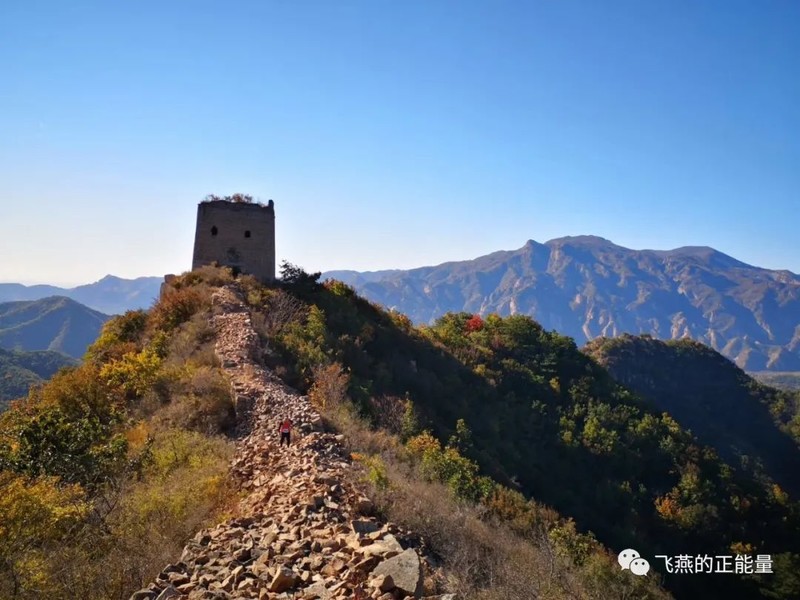 董家口一段的长城不再是断壁残垣,而是很完整的风格各异的烽火台,黛青色的墙砖高耸如云,看着特别宏伟壮观,烽火台在阳光下默然站立,风在无情地怒吼,天湛蓝湛蓝的,山坡上红的绿的黄的各种颜色的树木无序铺陈着,这一幅4D画面就这样展现在你的眼前,它们经历了历史的沧桑和无尽的岁月,震撼着你的感官直达你的心灵。