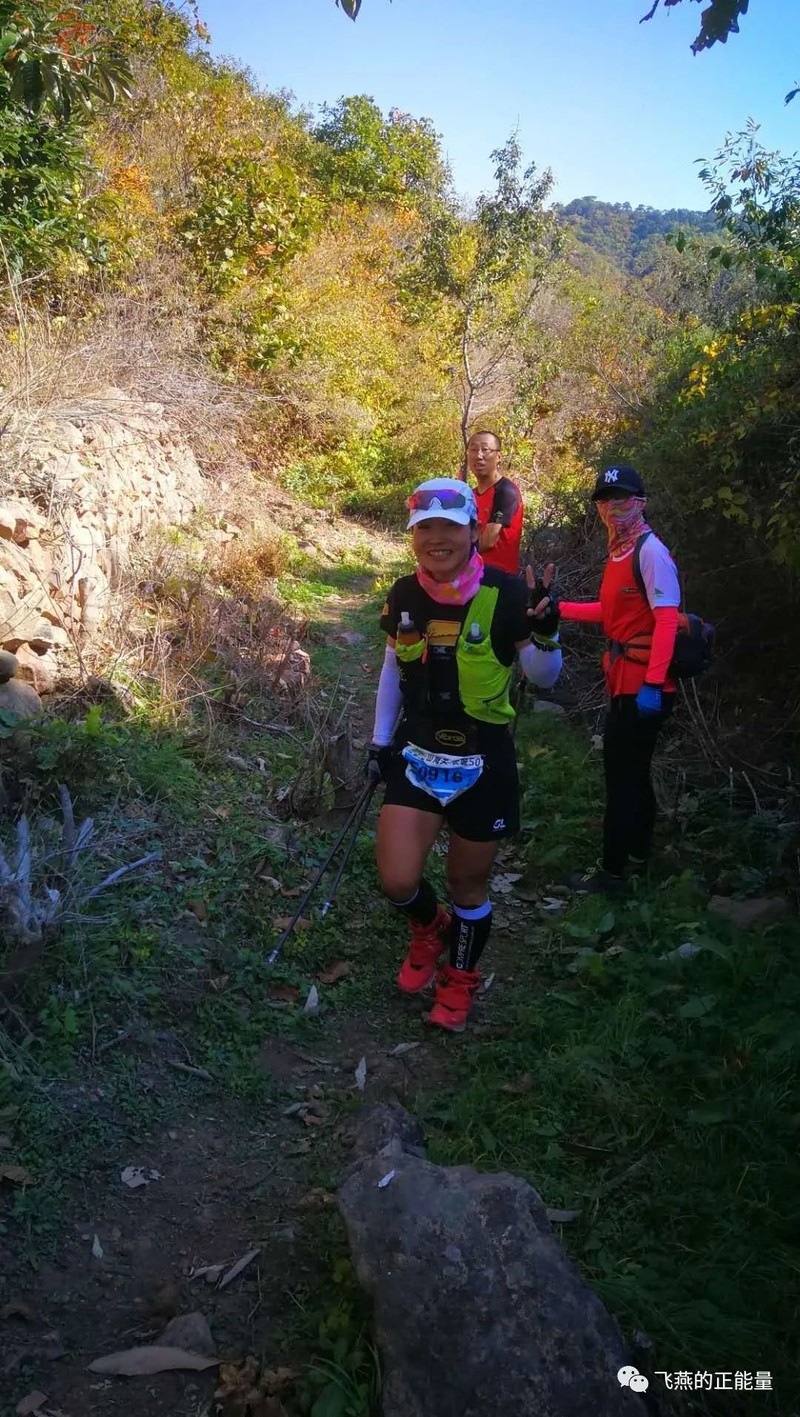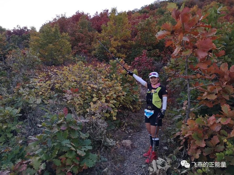 我在CP1以后的山上遇到唐山来的小姑娘刘慧君,那身材那长相,啧啧,明明可以靠颜值偏偏要靠实力那种。我们前前后后一起跑了好几公里。她是全马320的大神,上坡不用手杖蹬蹬蹬蹬就上去了,轻轻松松超过我,但是下坡她就不敢跑,每次都是上坡我让她先走,下坡我请她借过。她说这次是她第一次跑越野赛——好好练练下坡,这将来也是越野赛的站台选手。
