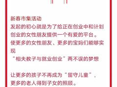 宝妈“她创业”新春市集即将开集啦,欢迎各位亲们踊跃参加!活动时间:3月3日、4日 9:00—17:00活动地点:秦皇岛市妇女儿童活动中心三楼多功能教室(建设大街与民族路交叉口) 集活动参加宝妈:1、Q觉染古皂 乌兰其其格2、Q流星小筑 毛毛3、Q绳编挂毯 月月4、Q手作包包等 橙子5、Q营养心理沙龙 乌云其其格6、Q趣味亲子英语 袁老师7、Lan.手作 岚姐8 Q宝宝家 六月妈妈9.育儿背巾推广 柳娇10.Mi➕手工耳饰 小米11.flowers手工坊 媛媛12国珍营养餐 崔芳语13贝儿聪全脑开发 鲁晓璐14.檬娃家婴幼儿手工辅食、地主妈手工阿胶范玉冬15.Qhellocarrot原创手作 圆圆16-21.妇儿中心22.瑞格口腔 燕子23.百变泥匠 燕子24