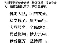 建军2020年8月1日中国人民解放军成立93周年人民解放军被称作“最可爱的人”海港区健步走运动发展2019年春夏之交,秦皇岛纵横山海户外运动协会开始推广健步走运动,主要成员有:李雪松、王瑞兰、李岩、张泗、解磊淼、胡惠荣等。山海关威远徒步队张庆队长和朱婧媛也从山海关过来亲自示范后虽受疫情影响,但队员并没有忘记坚持锻炼,疫情过后,由协会优秀志愿者张福忠带队,坚持健走,并逐步发展出约40名核心骨干会员,每天研究分析如何规范队形,规范走姿,并依托协会官网会员管理体系,基本形成了一套行之有效的管理模式。现人民公园健走队周一至周六,晚7-8点,开展健步走运动,并带动大批群众参与健步走运动。建队2020年8月1日海港区人民公园健走队正式成立就是要学习解放军雷厉风行的作风团结友爱、勇敢乐观的精神是我们发展秦皇岛健步走运动建设秦皇岛健步走团队必须要学习和遵守汇聚一堂是健步走运动让我们相识、相知成为伙伴、成为