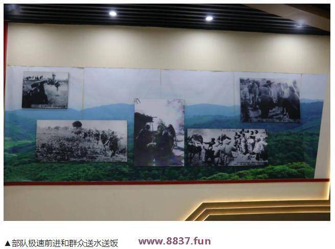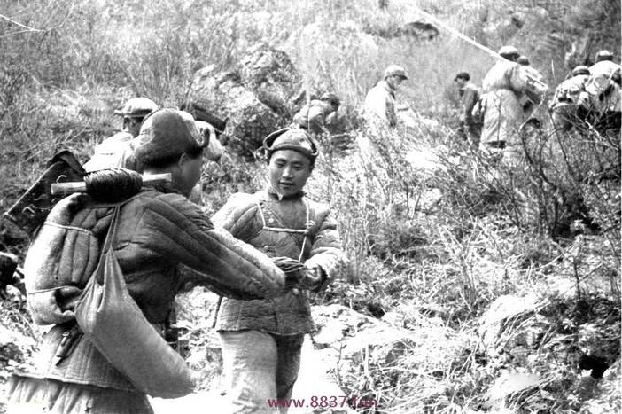 “部队穿村而过,脚步不歇,手里接过乡亲们递过来的热乎乎的干粮,兜里塞满了红枣、核桃,有的老大爷把烧鸡撕成碎条,紧跟着脚步不停的战士,往战士的嘴里送。随部队行动的担架队多半是男青年,也有不少英姿飒爽的姑娘。”